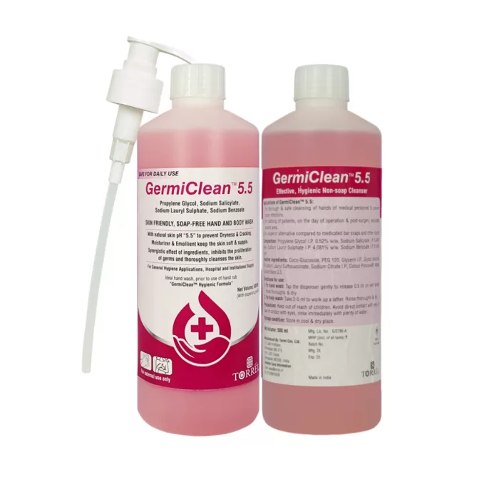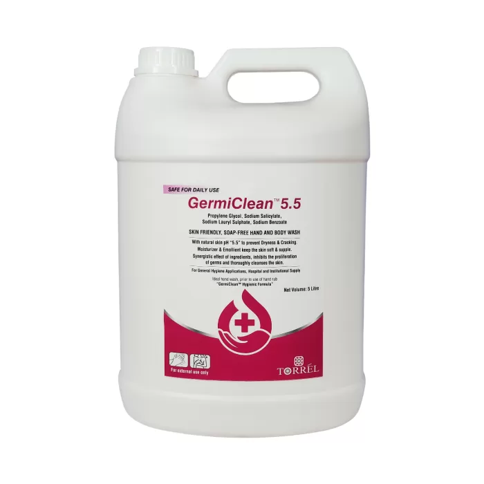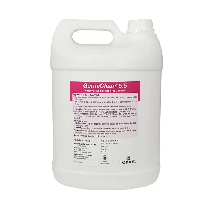 Germiclean 5.5 is a gentle, soap-free, and alkali-free hygienic wash lotion formulated to maintain the natural skin pH of 5.5. It effectively prevents dryness, cracking, and irritation by cleansing thoroughly without disturbing the skin’s protective lipid layer. Enriched with moisturizers and emollients, it ensures soft, supple skin even after frequent use. The colorless solution leaves a pleasant fragrance, making it ideal for regular hand and body cleansing, particularly for those sensitive to conventional soaps.