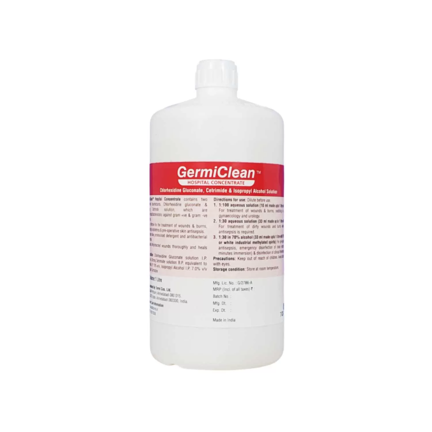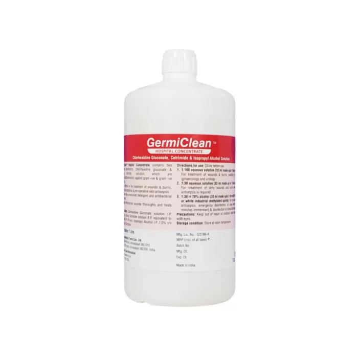 GermiClean Hospital Concentrate is a highly effective antiseptic designed to address the diverse needs of hospitals, clinics, and veterinary practices. It offers broad-spectrum bactericidal and detergent properties, providing fast and safe cleansing and healing for wounds, burns, and for disinfection of clinical equipment. With a unique combination of Chlorhexidine Gluconate, Cetrimide, and Isopropyl Alcohol, it offers superior antimicrobial efficacy and is ideal for various medical and veterinary applications.