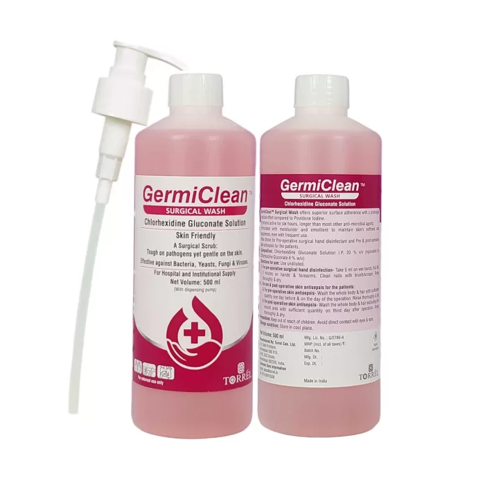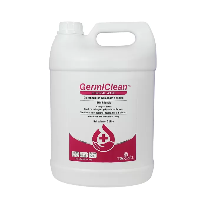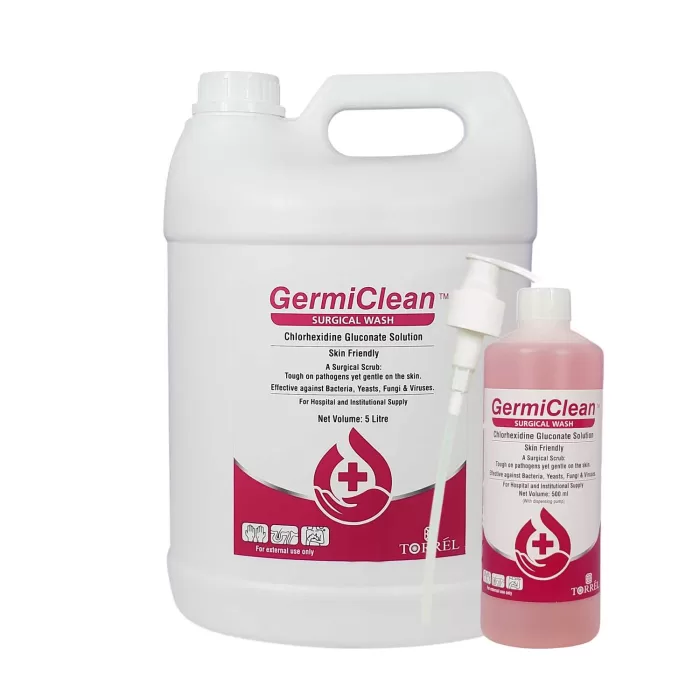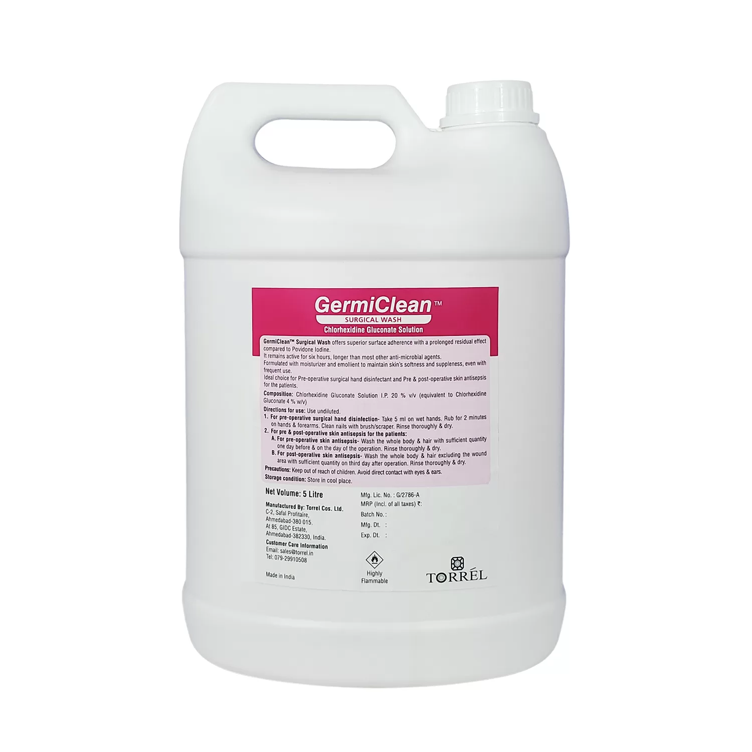 GermiClean Surgical Wash is an advanced pre-operative surgical hand wash and patient bathing solution with Chlorhexidine Gluconate, designed for comprehensive protection against a wide array of pathogens, including bacteria, yeasts, fungi, and viruses. The formulation ensures optimal disinfection, with Chlorhexidine Gluconate binding strongly to skin, mucosa, and tissues for minimal absorption and superior surface adherence compared to Povidone Iodine. The skin-friendly formula includes moisturizers and emollients to maintain skin softness and suppleness, even with frequent use. It is ideal for pre- and post-operative hand and skin disinfection in hospital and clinical settings.
