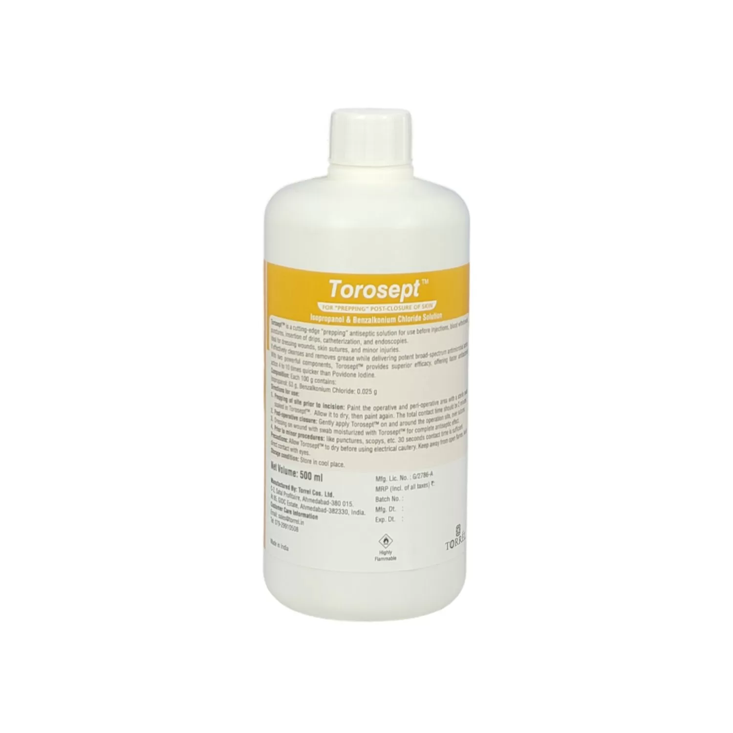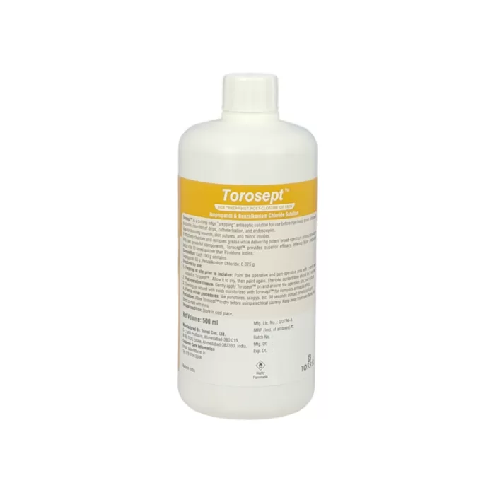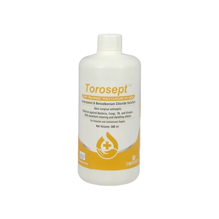 Torosept is a powerful antiseptic solution offering three distinct advantages over traditional products like povidone iodine. It provides quicker antibacterial activity with a strong residual effect, making it ideal for use in surgical and medical procedures. Unlike povidone iodine, Torosept does not stain the skin post-procedure. It has potent broad-spectrum antimicrobial efficacy against a wide range of microbes, including viruses (such as hepatitis B and HIV), fungi, and bacteria (including staphylococci and tuberculosis). Additionally, Torosept is an effective antiseptic for prepping the skin post-closure of wounds, with a defatting effect that cleanses and degreases the skin.