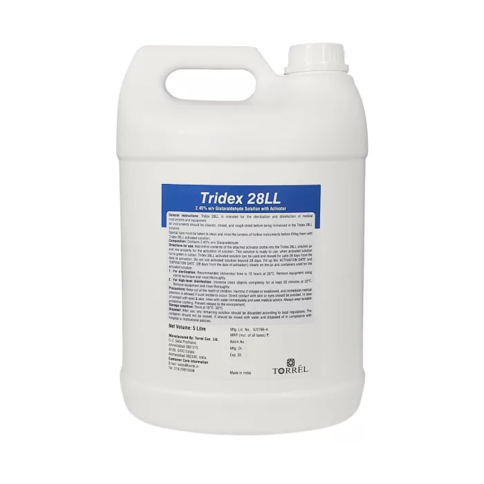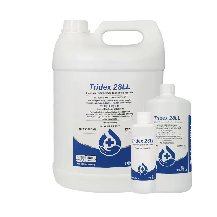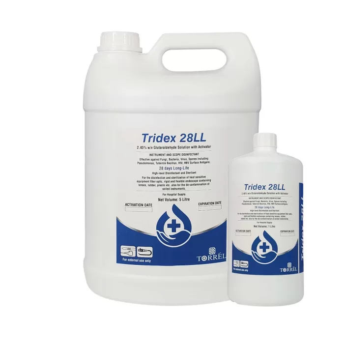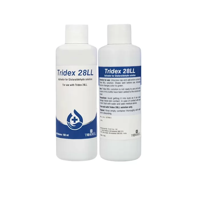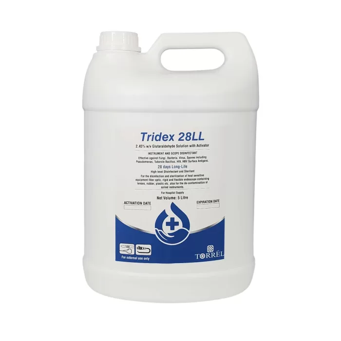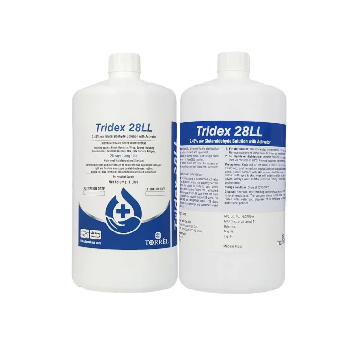 TRIDEX – 28 LL is a long-life glutaraldehyde solution designed for the high-level disinfection and sterilization of medical instruments. It is specifically formulated to remain effective for 28 days, offering consistent performance throughout its use. TRIDEX – 28 LL provides reliable, rapid antimicrobial action against a broad spectrum of pathogens, including bacteria, viruses, fungi, and spores.